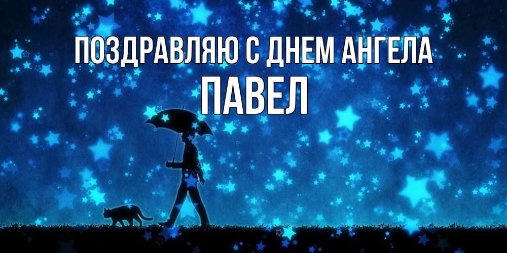 Открытка Поздравляю с днем Ангела Павел. прогулка под зонтом. ночные прогулки с котом под звездами