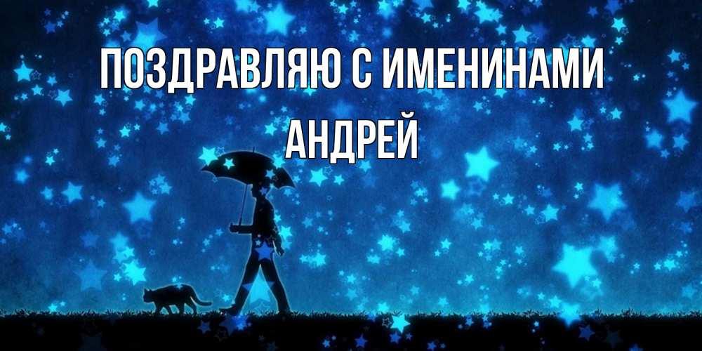 Открытка Поздравляю с именинами Андрей. прогулка под зонтом. ночные прогулки с котом под звездами