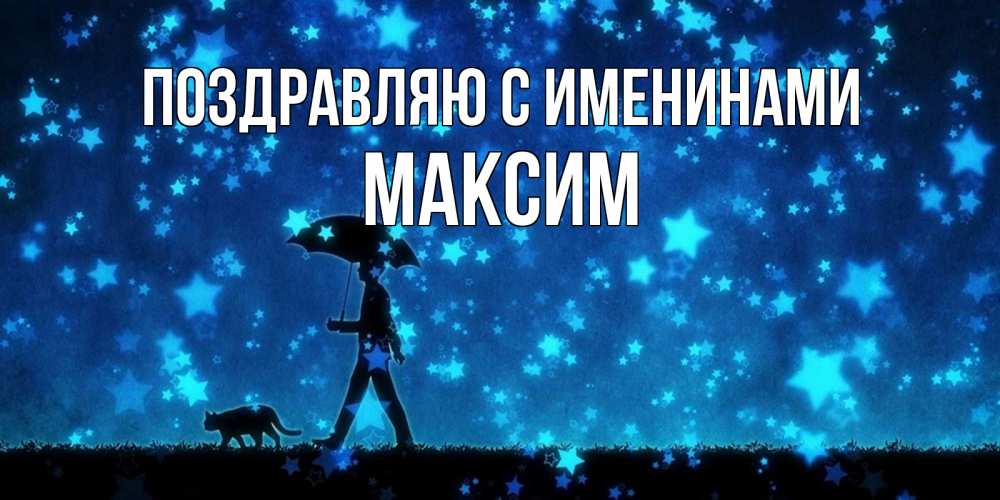 Открытка Поздравляю с именинами Максим. прогулка под зонтом. ночные прогулки с котом под звездами