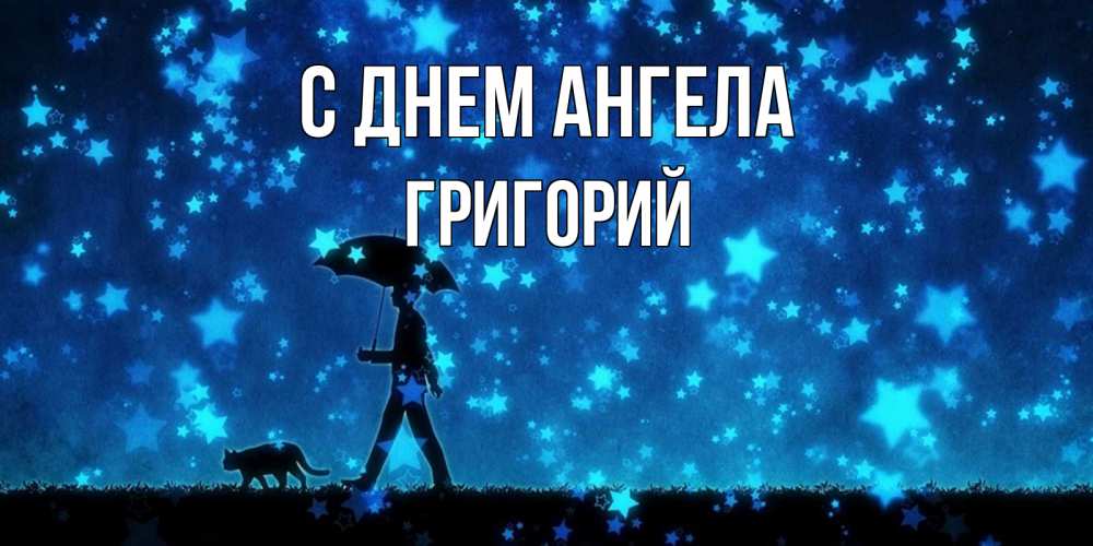 Открытка С днем Ангела Григорий. прогулка под зонтом. ночные прогулки с котом под звездами