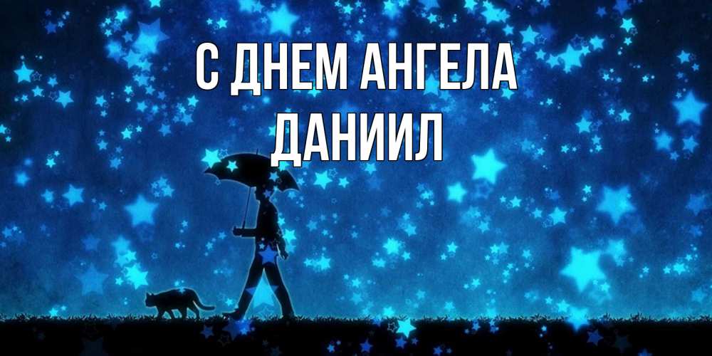 Открытка С днем Ангела Даниил. прогулка под зонтом. ночные прогулки с котом под звездами