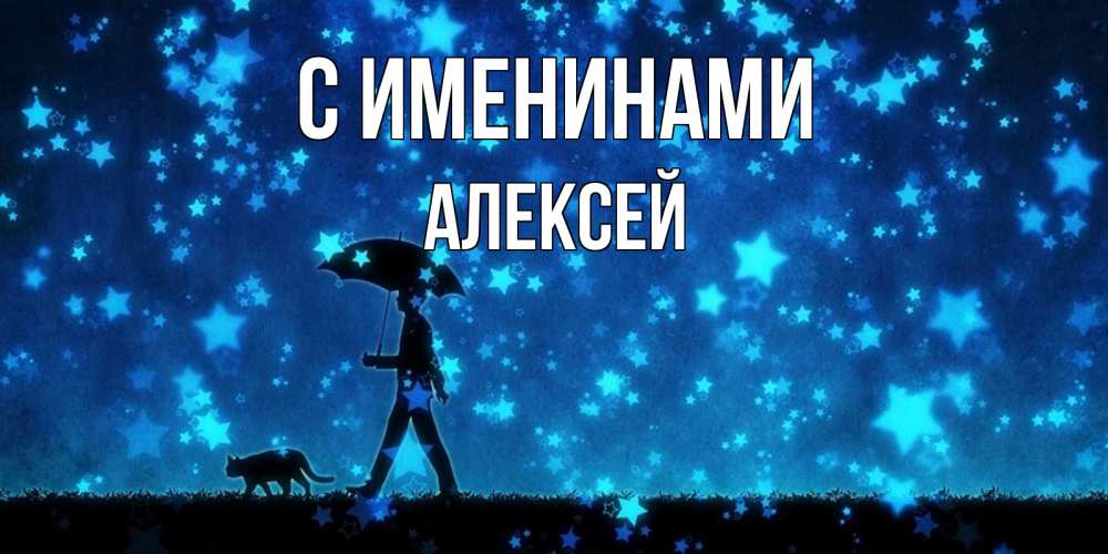 Открытка С именинами Алексей. прогулка под зонтом. ночные прогулки с котом под звездами