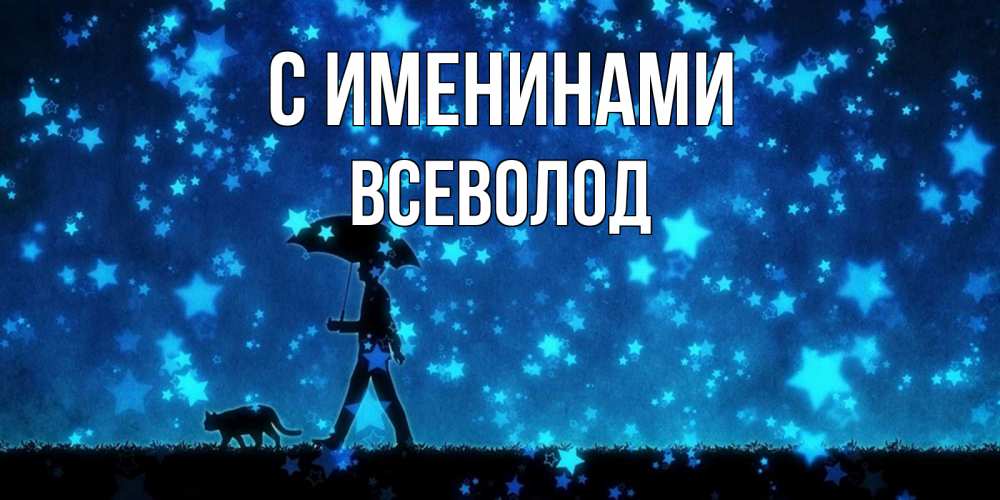 Открытка С именинами Всеволод. прогулка под зонтом. ночные прогулки с котом под звездами