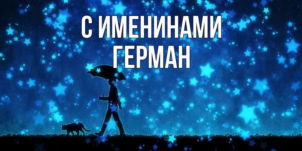 Открытка С именинами Герман. прогулка под зонтом. ночные прогулки с котом под звездами