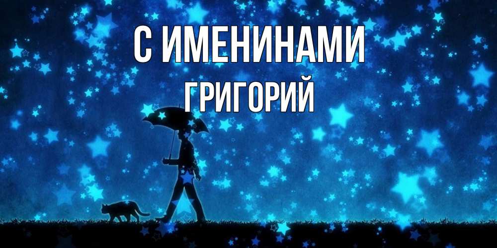 Открытка С именинами Григорий. прогулка под зонтом. ночные прогулки с котом под звездами