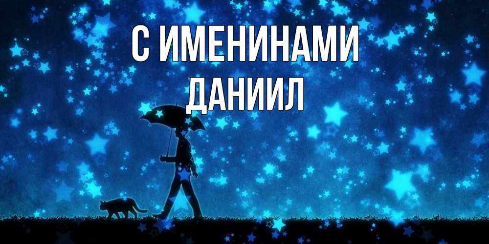 Открытка С именинами Даниил. прогулка под зонтом. ночные прогулки с котом под звездами