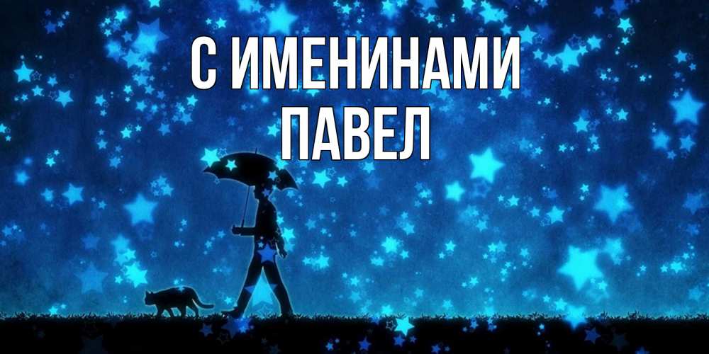 Открытка С именинами Павел. прогулка под зонтом. ночные прогулки с котом под звездами