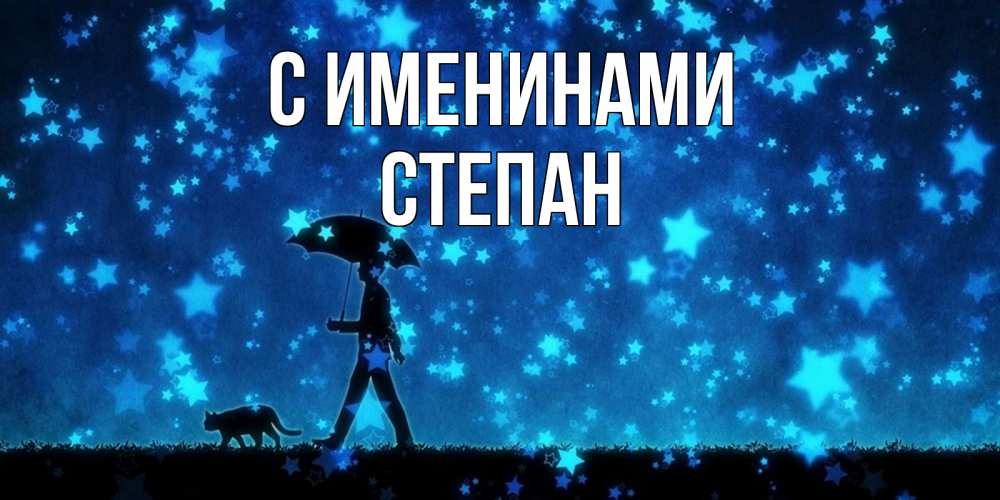 Открытка С именинами Степан. прогулка под зонтом. ночные прогулки с котом под звездами