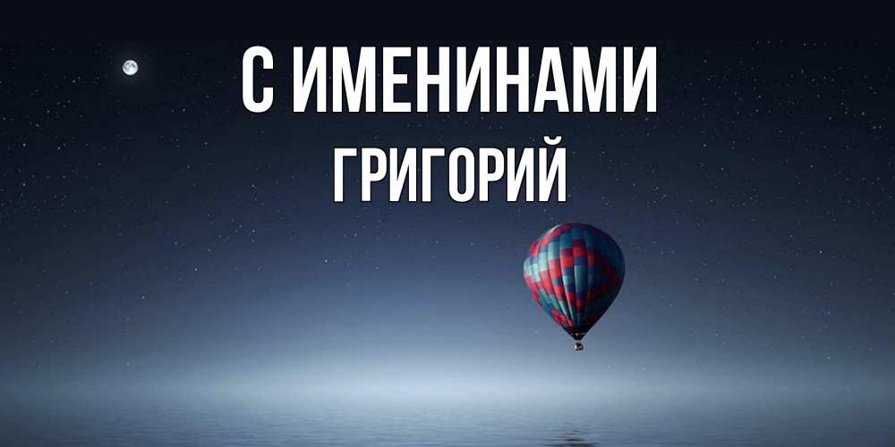 Открытка С именинами Григорий. воздушный шар на фоне луны и воды. ночная открытка