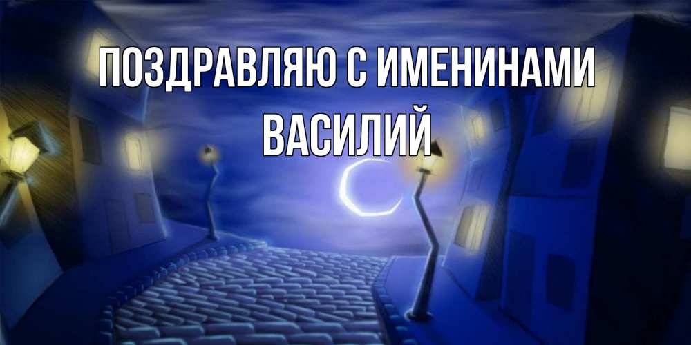 Открытка Поздравляю с именинами Василий. ночной город фонари луна и свет в окнах. сладких снов ночному городу