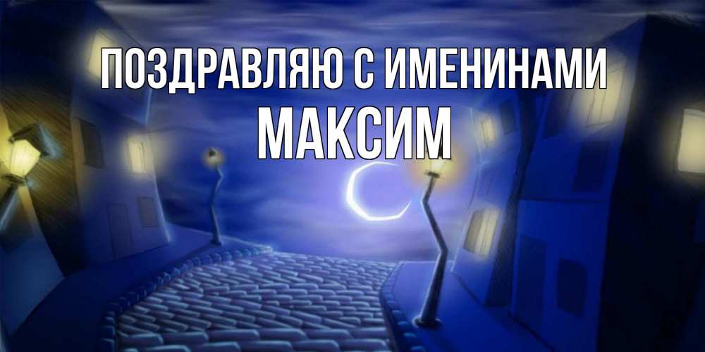 Открытка Поздравляю с именинами Максим. ночной город фонари луна и свет в окнах. сладких снов ночному городу