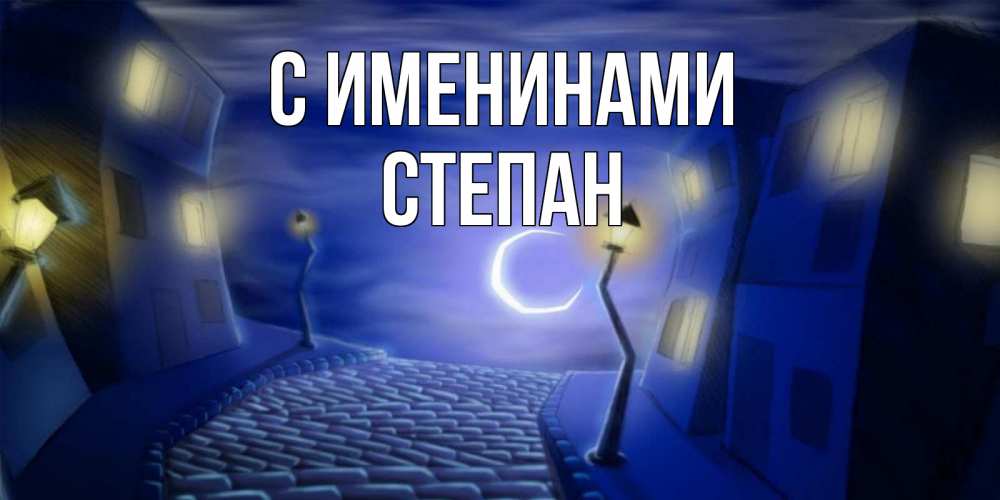 Открытка С именинами Степан. ночной город фонари луна и свет в окнах. сладких снов ночному городу