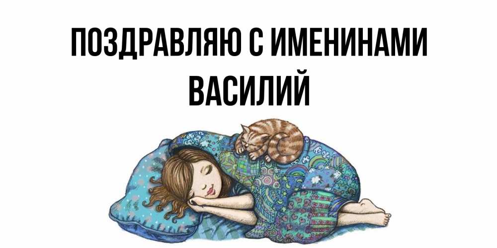 Открытка Поздравляю с именинами Василий. девочка спит с котом. пожелания сладких снов для подруги