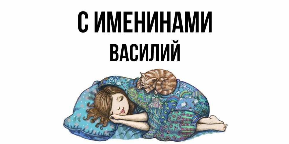 Открытка С именинами Василий. девочка спит с котом. пожелания сладких снов для подруги