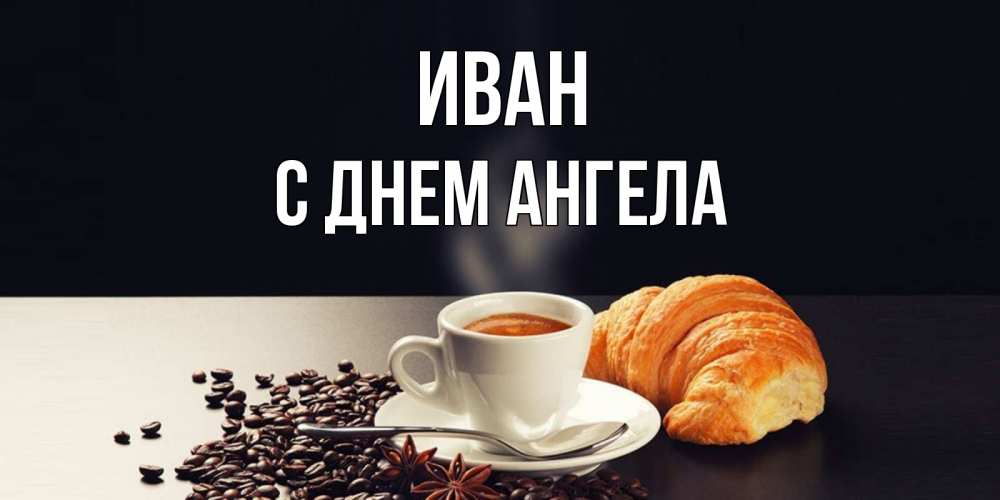 Открытка Иван С днем ангела. круасан и кофе. зерна кофе и кофе на завтрак с круасаном