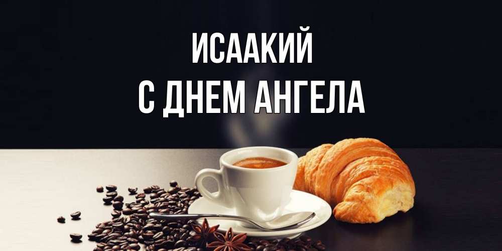 Открытка Исаакий С днем ангела. круасан и кофе. зерна кофе и кофе на завтрак с круасаном
