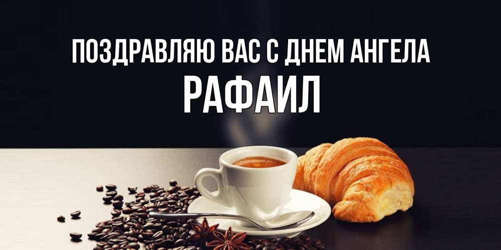 Открытка Поздравляю Вас с днем Ангела Рафаил. круасан и кофе. зерна кофе и кофе на завтрак с круасаном