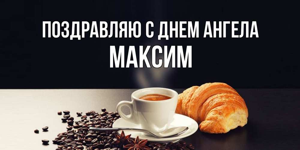 Открытка Поздравляю с днем Ангела Максим. круасан и кофе. зерна кофе и кофе на завтрак с круасаном