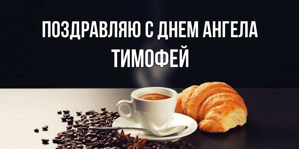 Открытка Поздравляю с днем Ангела Тимофей. круасан и кофе. зерна кофе и кофе на завтрак с круасаном