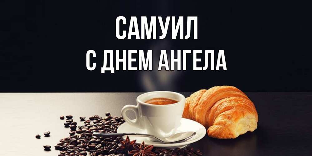 Открытка Самуил С днем ангела. круасан и кофе. зерна кофе и кофе на завтрак с круасаном