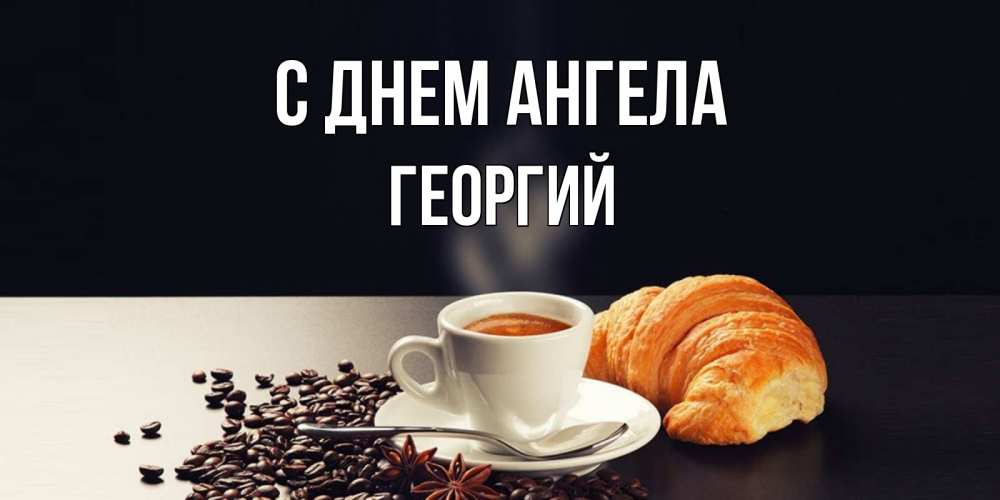 Открытка С днем Ангела Георгий. круасан и кофе. зерна кофе и кофе на завтрак с круасаном