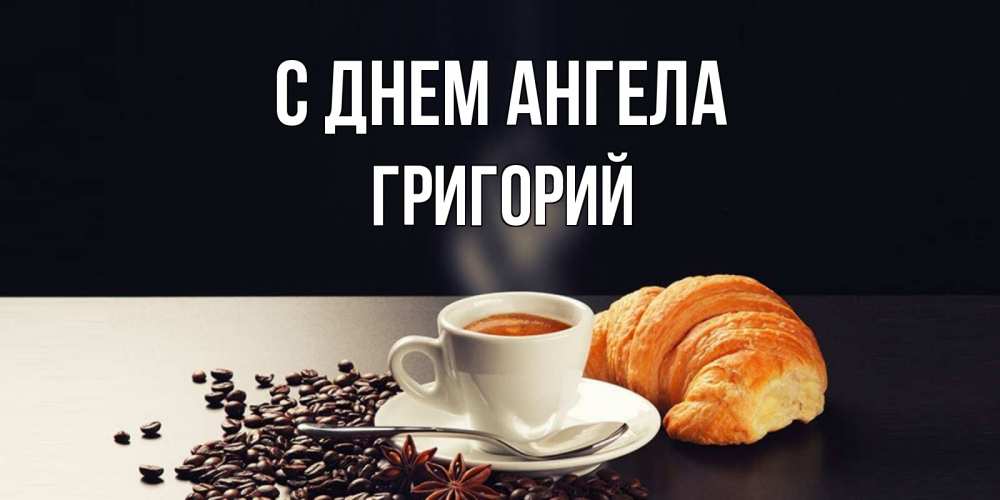 Открытка С днем Ангела Григорий. круасан и кофе. зерна кофе и кофе на завтрак с круасаном