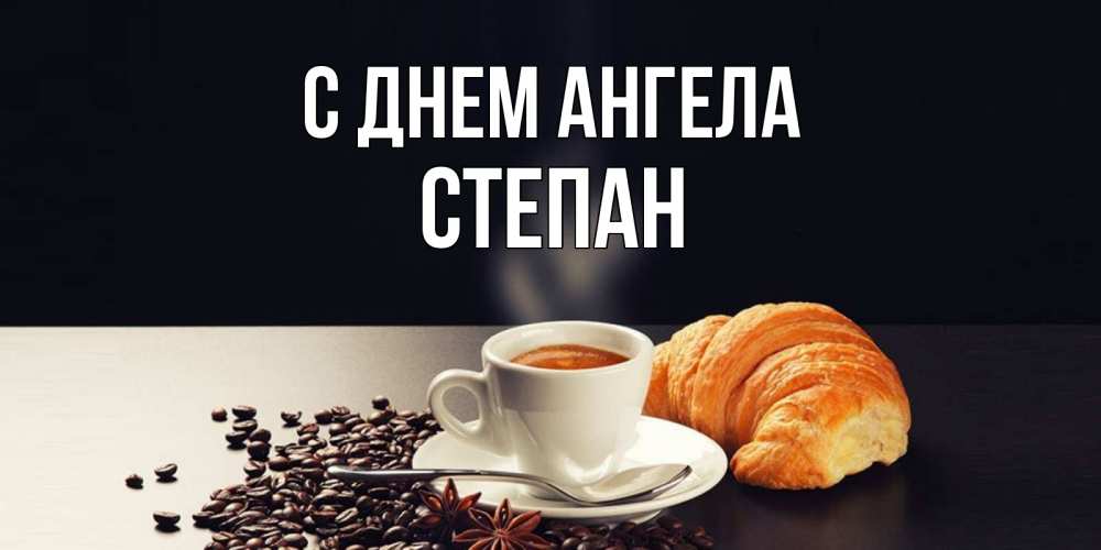 Открытка С днем Ангела Степан. круасан и кофе. зерна кофе и кофе на завтрак с круасаном