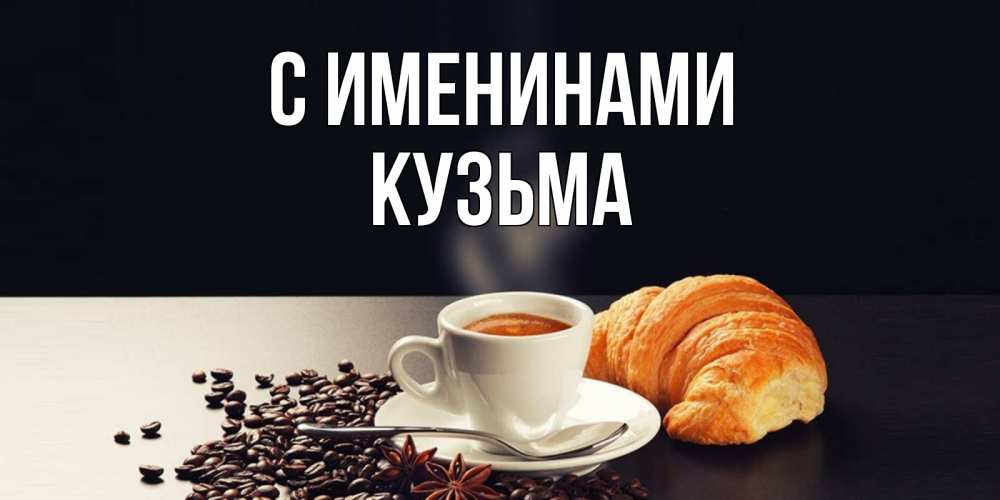 Открытка С именинами Кузьма. круасан и кофе. зерна кофе и кофе на завтрак с круасаном