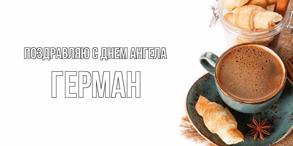 Открытка Поздравляю с днем Ангела Герман. кофе и булочка на утро. кофе с пенкой