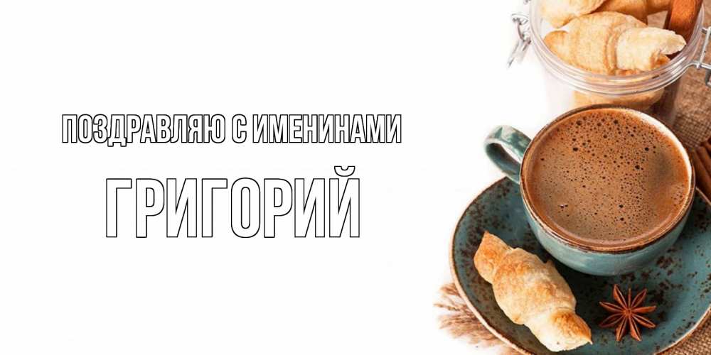 Открытка Поздравляю с именинами Григорий. кофе и булочка на утро. кофе с пенкой