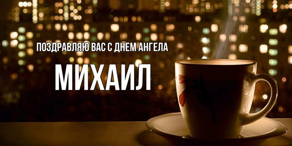 Открытка Поздравляю Вас с днем Ангела Михаил. кружка кофе для поднятия настроения. утрешнее настроение