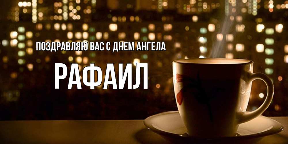 Открытка Поздравляю Вас с днем Ангела Рафаил. кружка кофе для поднятия настроения. утрешнее настроение