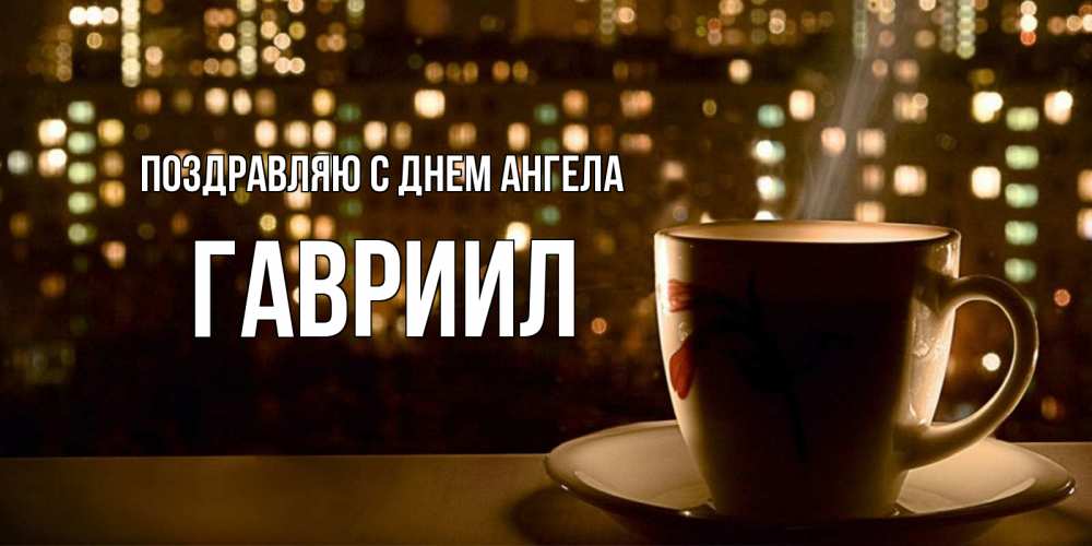 Открытка Поздравляю с днем Ангела Гавриил. кружка кофе для поднятия настроения. утрешнее настроение