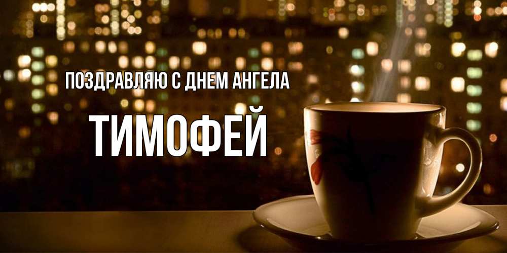 Открытка Поздравляю с днем Ангела Тимофей. кружка кофе для поднятия настроения. утрешнее настроение