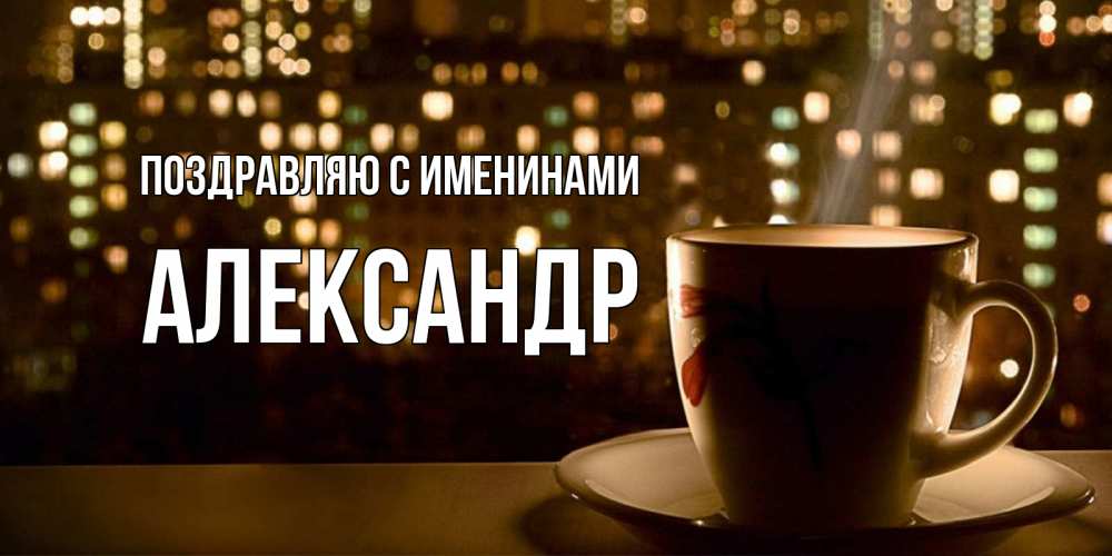 Открытка Поздравляю с именинами Александр. кружка кофе для поднятия настроения. утрешнее настроение