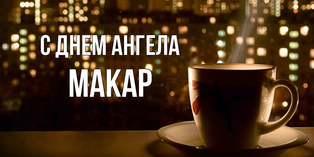Открытка С днем Ангела Макар. кружка кофе для поднятия настроения. утрешнее настроение