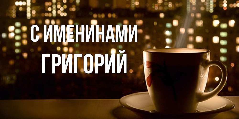 Открытка С именинами Григорий. кружка кофе для поднятия настроения. утрешнее настроение