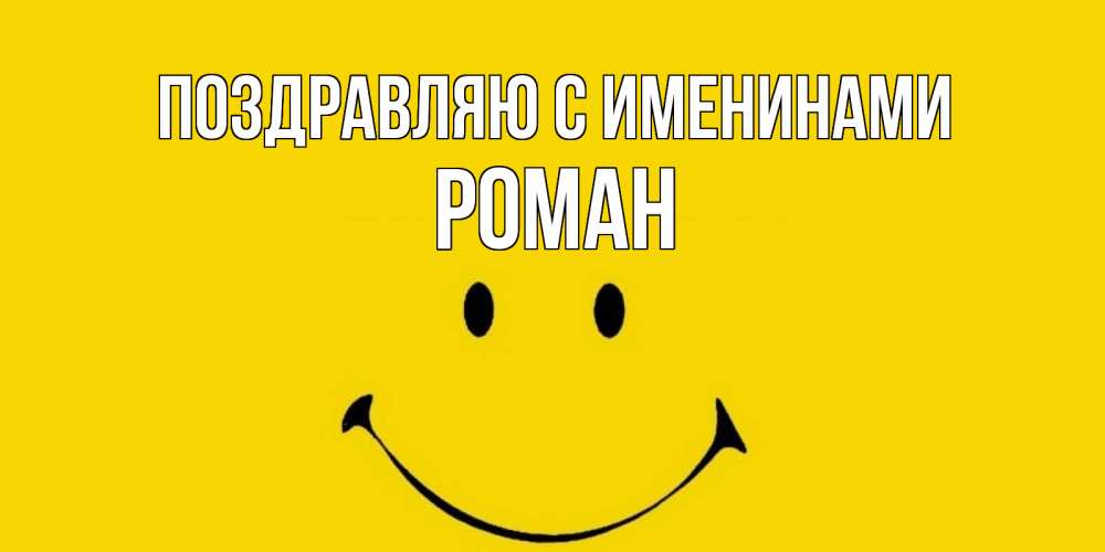 Открытка Поздравляю с именинами Роман. смайл позитив желтый фон. радость и улыбка