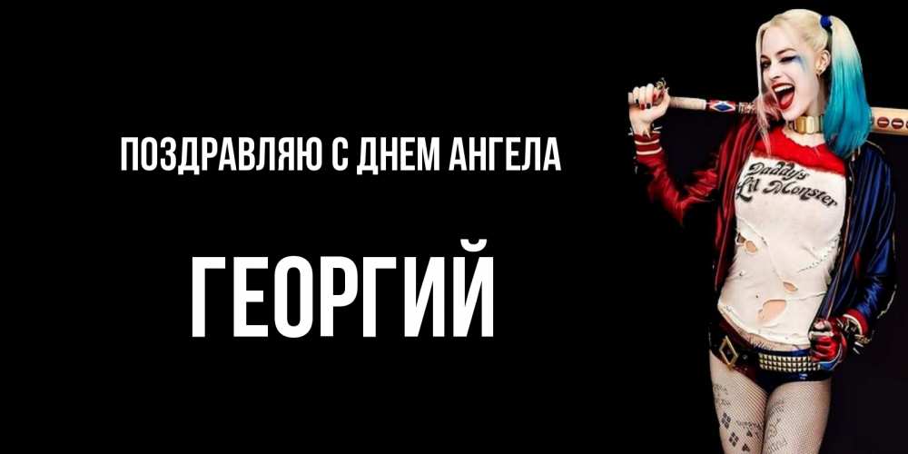 Открытка Поздравляю с днем Ангела Георгий. харли квинн улыбнись. пожелания быть позитивным