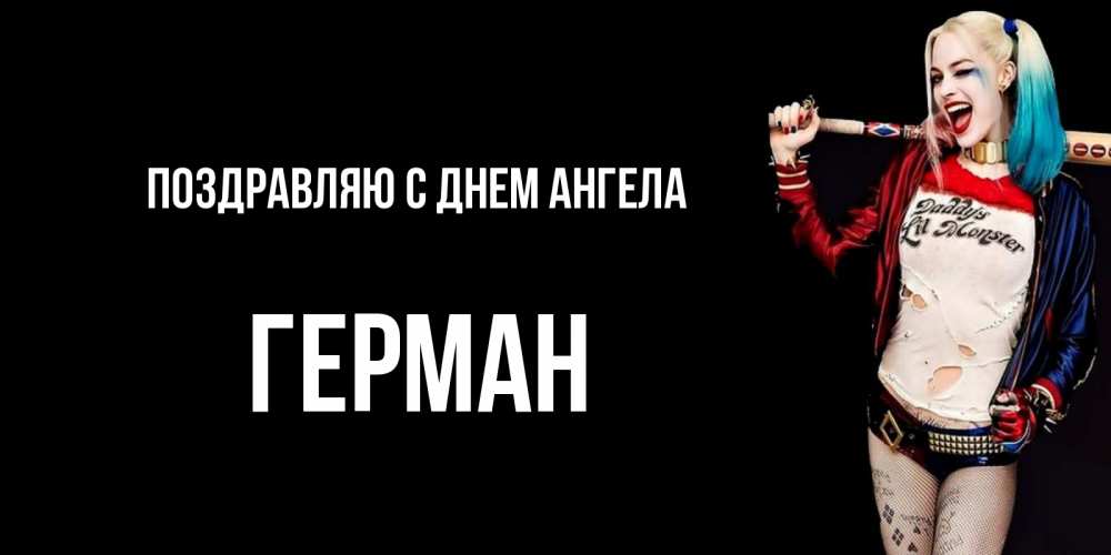 Открытка Поздравляю с днем Ангела Герман. харли квинн улыбнись. пожелания быть позитивным
