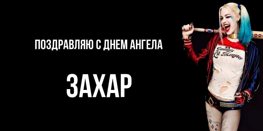 Открытка Поздравляю с днем Ангела Захар. харли квинн улыбнись. пожелания быть позитивным