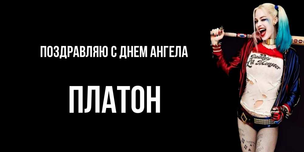 Открытка Поздравляю с днем Ангела Платон. харли квинн улыбнись. пожелания быть позитивным