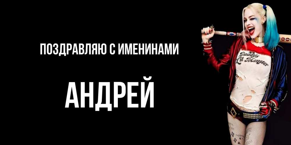 Открытка Поздравляю с именинами Андрей. харли квинн улыбнись. пожелания быть позитивным