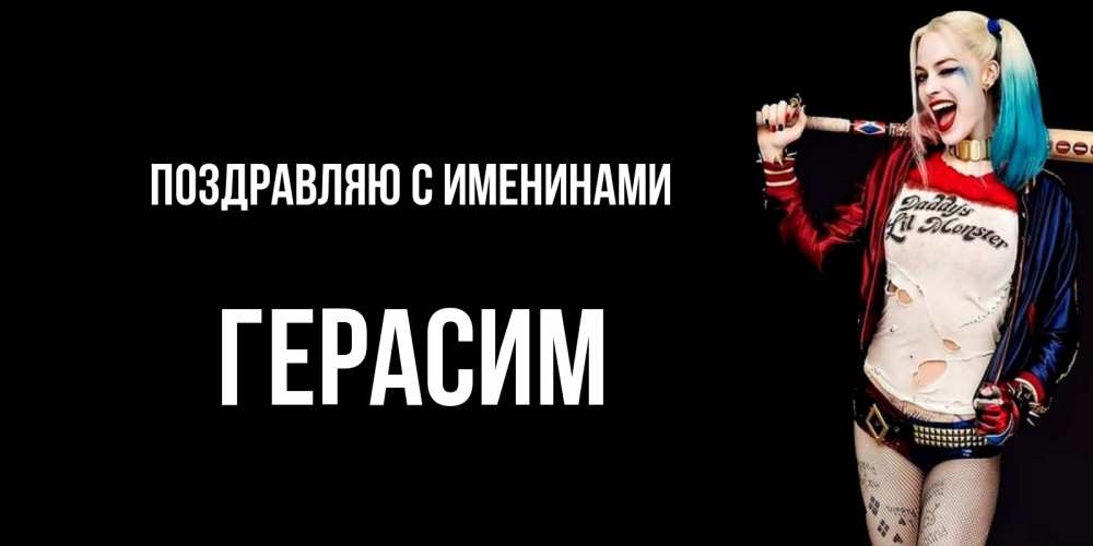 Открытка Поздравляю с именинами Герасим. харли квинн улыбнись. пожелания быть позитивным