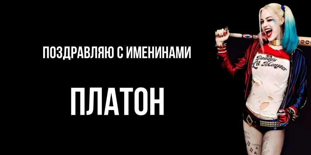 Открытка Поздравляю с именинами Платон. харли квинн улыбнись. пожелания быть позитивным