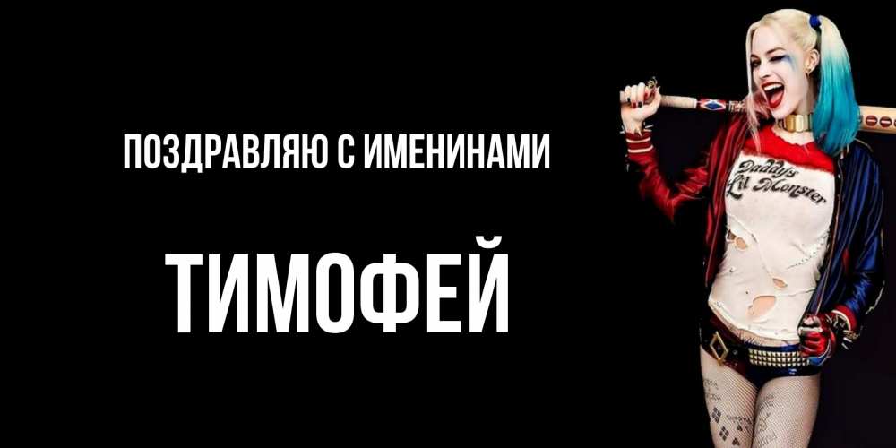 Открытка Поздравляю с именинами Тимофей. харли квинн улыбнись. пожелания быть позитивным