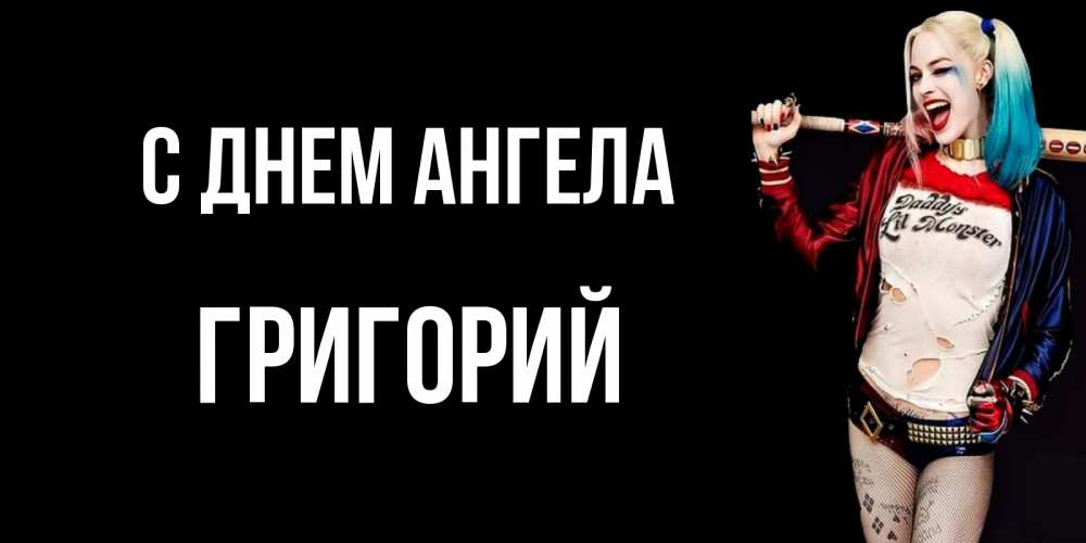 Открытка С днем Ангела Григорий. харли квинн улыбнись. пожелания быть позитивным