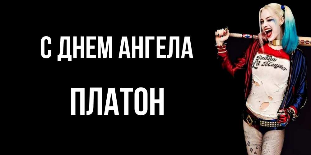 Открытка С днем Ангела Платон. харли квинн улыбнись. пожелания быть позитивным