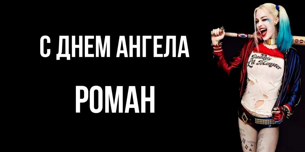 Открытка С днем Ангела Роман. харли квинн улыбнись. пожелания быть позитивным