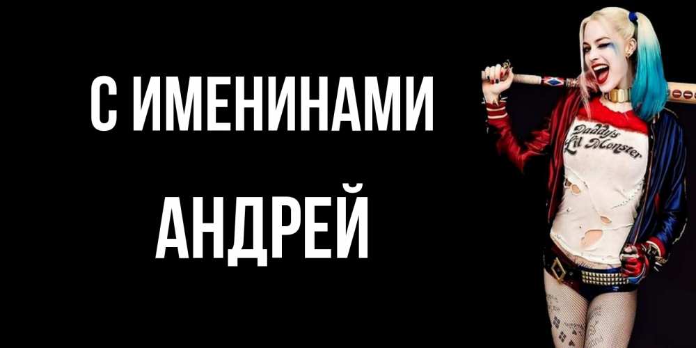 Открытка С именинами Андрей. харли квинн улыбнись. пожелания быть позитивным
